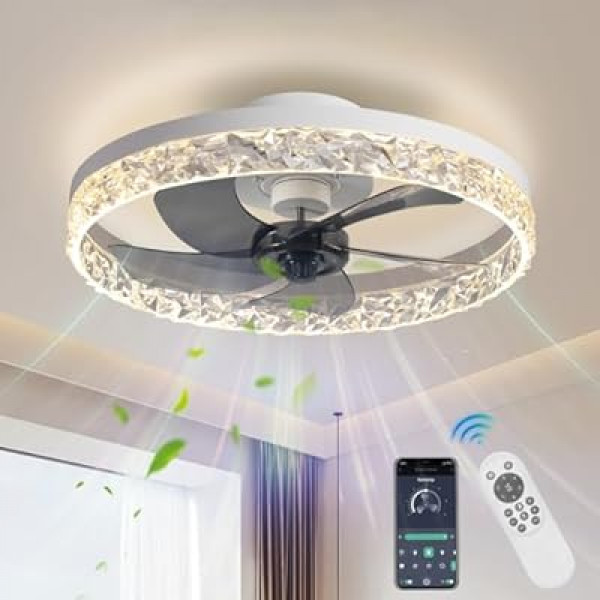 According to our analysis of the product's design, the AHAWILL model stands out due to its intricate crystal detailing. Unlike traditional ceiling fans with exposed blades, this low-profile unit features an enclosed design. The crystals are positioned to catch and refract light, creating a shimmering effect that adds a touch of "glam" to bedrooms, dining areas, or walk-in closets. Our research suggests that this design is particularly popular for those looking to elevate their interior decor while maintaining a clean, modern silhouette.