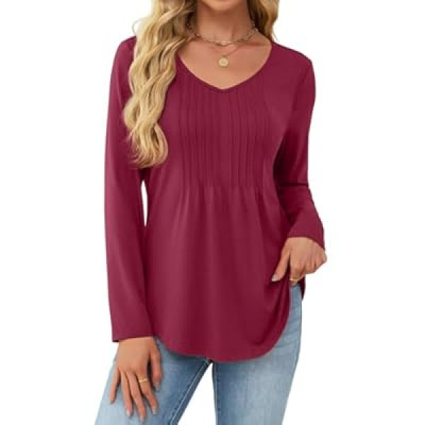 JUSTFASHIONNOW Long Sleeve Shirts for Women Dressy Casual Blouses Fall Tops Pleated V Neck Tu…