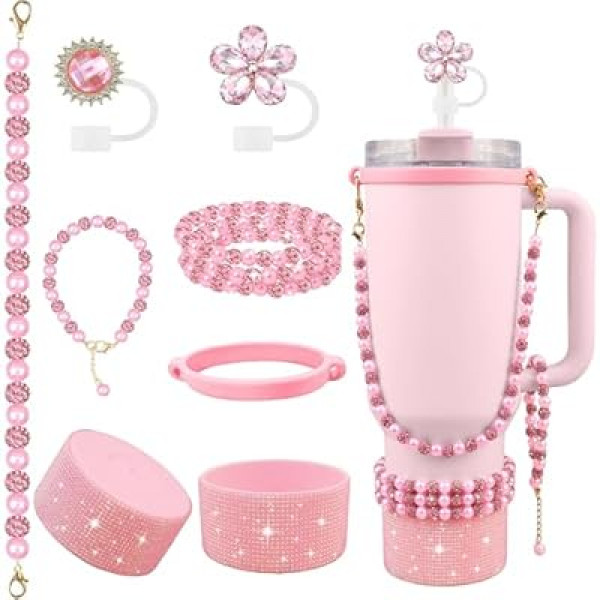 Hpebl 9PCS Pink of Stanley Cup Accessories Set 30/40 OZ Bling Pearls Rhinestones Charms for…