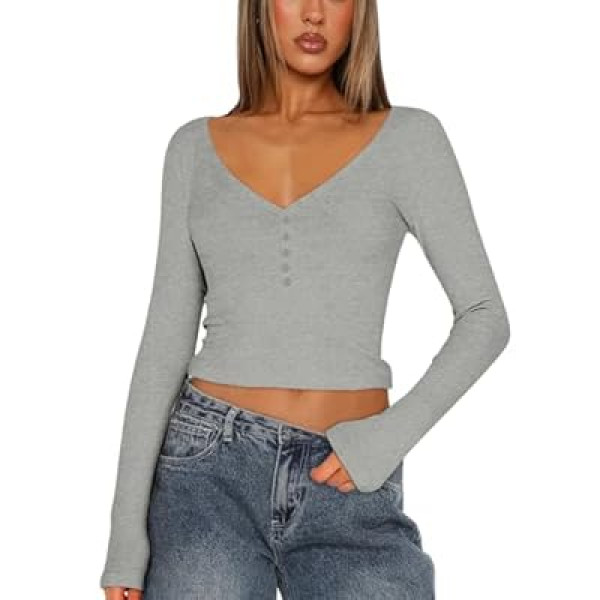 Women Long Sleeve V Neck Ribbed Crop Tight Shirts Button Down Cami Tops Slim Fit Y2k Cr…