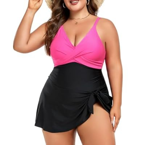 MFAVIP Women Plus Size Swim Dress Tummy Control One Piece Swimsuit Wrap Full Coverage M…