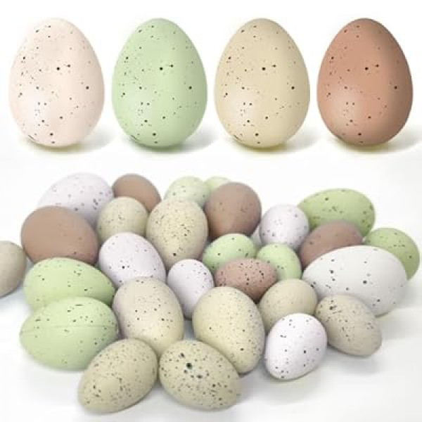 Based on our analysis of the product features, the Kidum set includes 36 pieces of plastic speckled eggs designed to mimic the appearance of natural bird eggs. The "speckled" finish provides a textured, realistic look that differentiates them from standard, solid-colored plastic eggs. Our research suggests that the color palette—typically featuring soft pastels and earthy tones—is specifically curated to complement modern farmhouse, traditional, and contemporary spring themes.