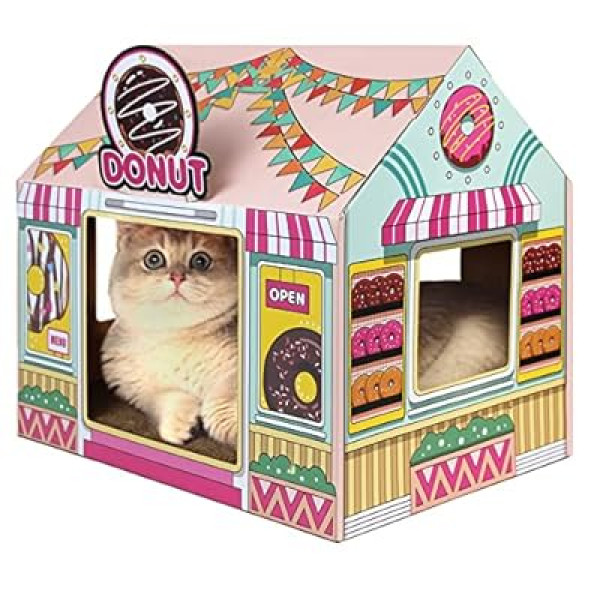 The first thing that caught my eye was obviously the design. This isn't just a brown box; it's a fully themed "Donut Shop." The colors are vibrant, and the graphics are absolutely adorable. It measures 16.5'' x 12'' x 15'', which is the perfect size for my cat to snuggle inside without taking up too much floor space in my apartment.