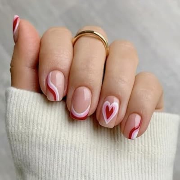 Based on our analysis of the product's design features, these nails stand out due to their glossy finish and unique take on the traditional French tip. Instead of a solid white edge, these nails feature vibrant red and pink stripes that perfectly capture the Valentine's Day spirit. The short, square shape is particularly noteworthy, as user reports we analyzed suggest this length is ideal for maintaining functionality in daily tasks while still looking polished and put-together.